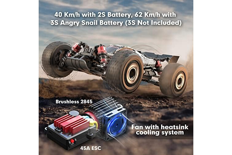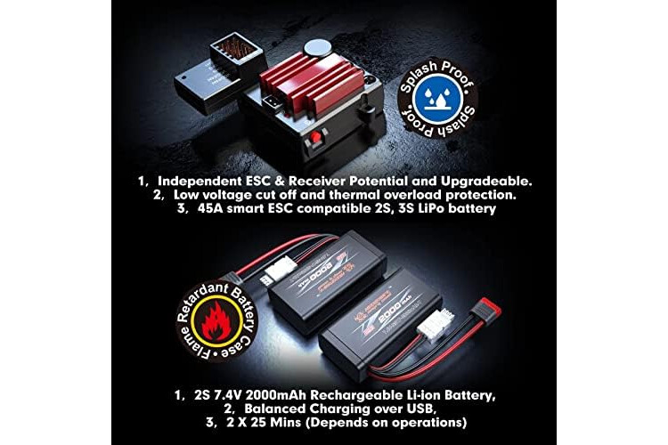 Brushless: Hobby 2845 4200KV, 4 pole high-torque motor with metal heatsink and cooling fans design. Independent receiver and 45A ESC make this car more potential and upgradeable. 2S 7.4V 2000 mAh rechargeable battery and brushless motor bursts out at 25+ mph (40 kph) for adults. (speed measured by GPS)
