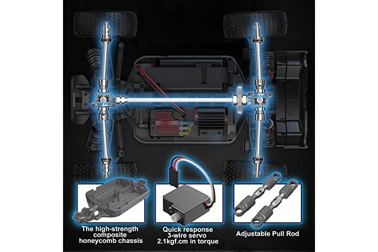 Built for the Track: The front short and rear long oil-filled shock settings better reduce drag in off-road races, and the downforce of the rear wing during the process of rapid power acceleration, and the long suspension at the rear end can better support the vehicle to maintain balance. At the same time, when jumping off-road, the long rear shock ensures that the chassis will not hit the ground.