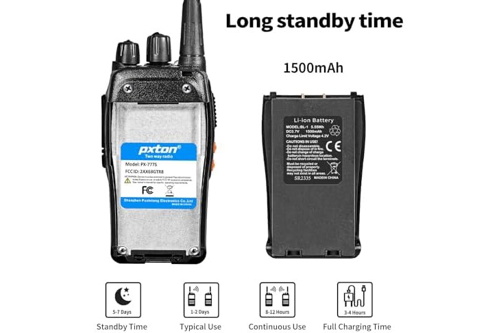 Durable Battery: The walkie-talkie is equipped with a reliable 1500mAh lithium battery, built to last. Under normal usage, it can last up to 120 hours on a full charge or up to 12 hours of continuous usage. Actual battery life depends on your frequency of use. A full charge typically takes 3-4 hours.