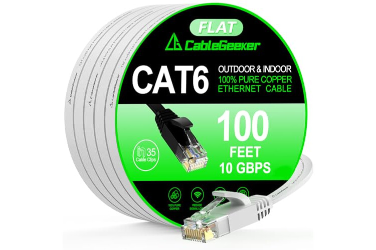 Cat 6 Ethernet Cable 100 ft, Indoor&Outdoor, High Speed 10Gbps Internet Network, Pure Copper Flat Ethernet Patch Cable Long, Computer LAN Cable with Clips & Straps for Router, Modem, PS4/5, White