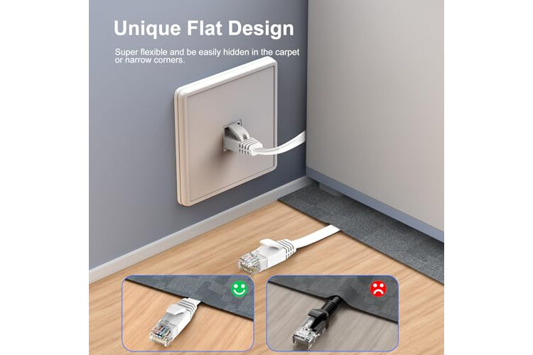 Space-Saving Flat Design: Flat Cat6 network cable is designed to prevent tangles and save space. It's highly flexible, making it easy to run under carpets, around doors, rotating arms, or drawers