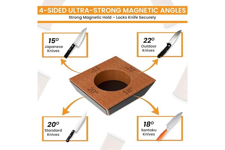 ๐ ๐๐ก๐๐ซ๐ฉ๐๐ง๐ข๐ง๐ ๐๐ง๐ ๐ฅ๐๐ฌ (๐๐ยฐ, ๐๐ยฐ, ๐๐ยฐ, ๐๐ยฐ): Designed for consistent and accurate sharpening, this system features four preset angles with strong magnets that hold your knife firmly in place, ideal for everything from fine slicing knives to durable utility blades.