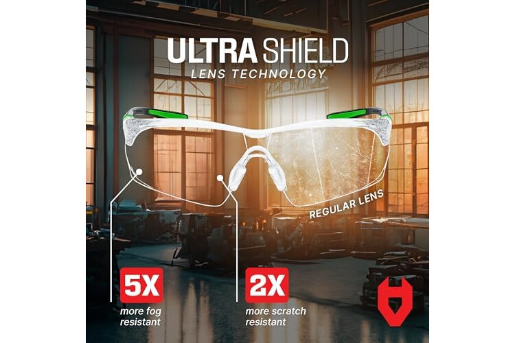 ULTRASHIELD LENS TECHNOLOGY — Compared to most clear protective glasses, the premium coating on our safety glasses anti fog is 5x more fog resistant and 2x more scratch resistant. No fog, no scratch, and zero optical distortion.