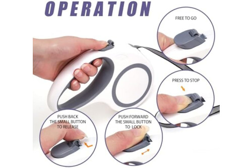 Simple operation: 1. When you want to slow down the dog, press the button and the rope will stop. 2. If you want to lock it, just push the small button forward. 3: To unlock, pull the small button back.