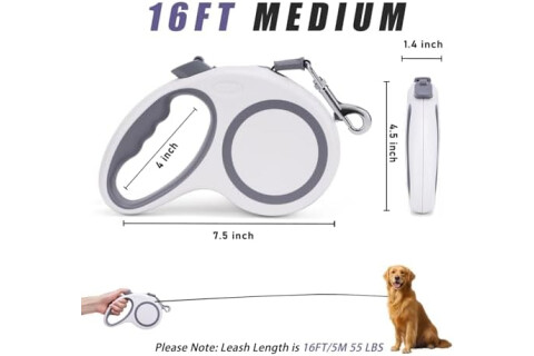 Retractable Dog Leash, 16 FT Retractable Leash for Dogs 0-55 lbs, Strong Nylon Tape No Tangle, One-Handed Brake, Pause, Lock, Perfect for Medium Large Dogs, White