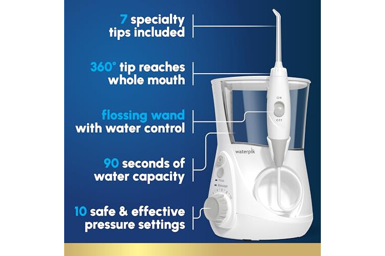 KEY FEATURES: 7 tips for multiple family members and needs, 10 safe and effective pressure settings, removable 22 oz reservoir (top-rack dishwasher safe for easy cleaning), 90+ secs floss time, 360 tip rotation, 120VAC/60Hz for use in North America only