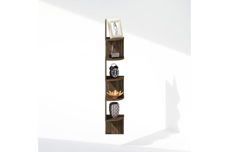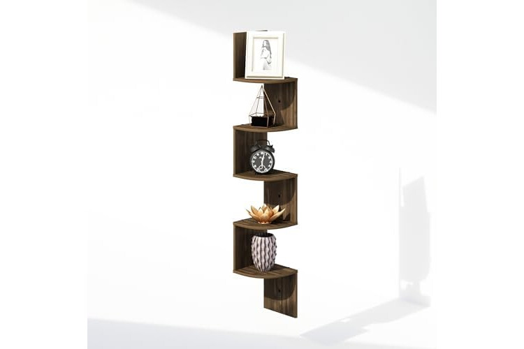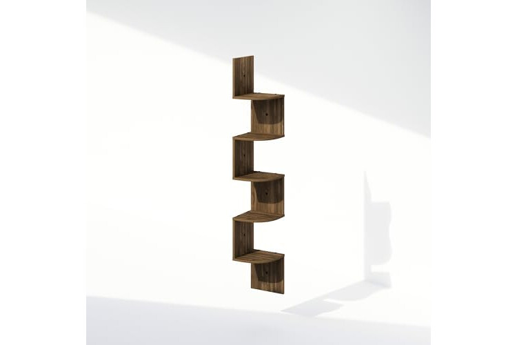 Furinno Rossi 5-Tier Floating Corner Shelf for Wall, Corner Zigzag Shelf Wall Mounted, Radial Wall Mount Shelves, for Home Office, Living Room, Bedroom, Bathroom, Columbia Walnut