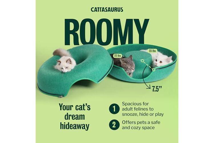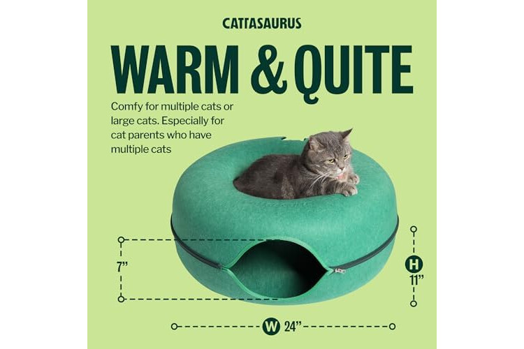 Cattasaurus Peekaboo Cat Cave Donut for Multiple & Large Cats up to 30-45 lbs, 3-in-1 Self Warming Cat Bed, Tunnel & Scratcher for Indoor Cats, Washable & Detachable Dog Bed (Forest Green, Large)