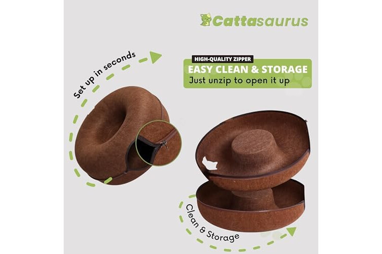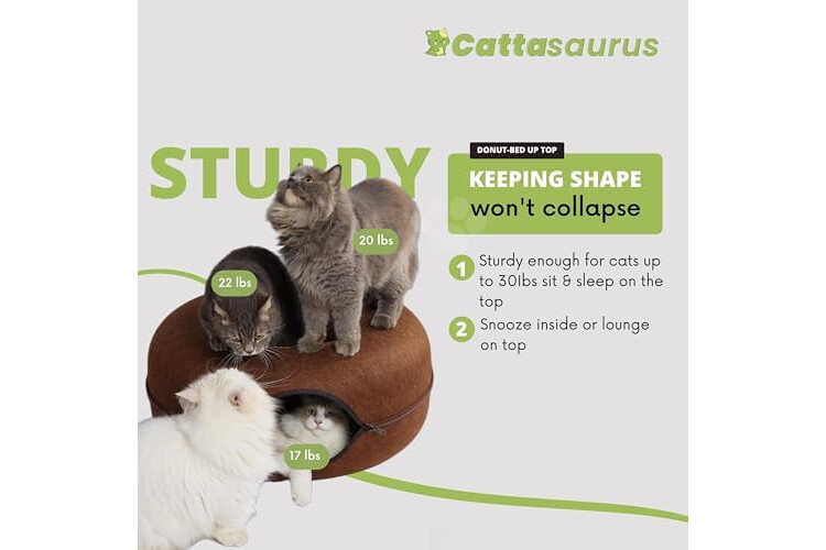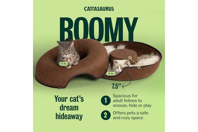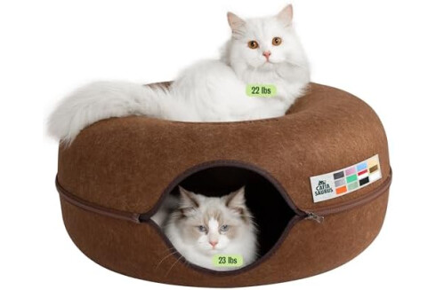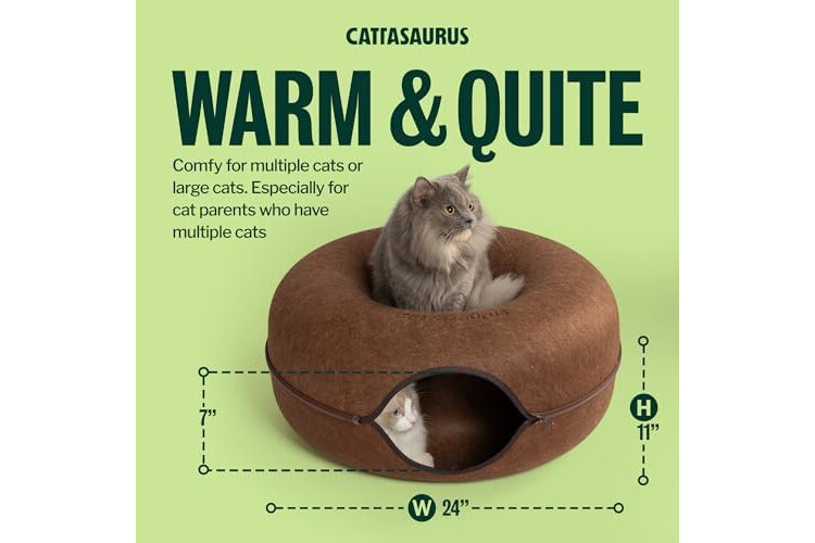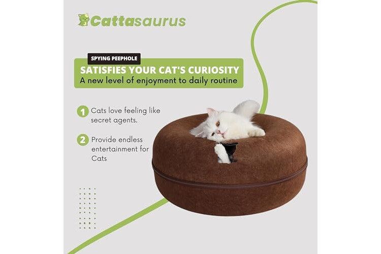 Cattasaurus Peekaboo Cat Cave Donut for Multiple & Large Cats up to 30-45 lbs, 3-in-1 Self Warming Cat Bed, Tunnel & Scratcher for Indoor Cats, Washable & Detachable Small Dog Bed (Brown, Large)