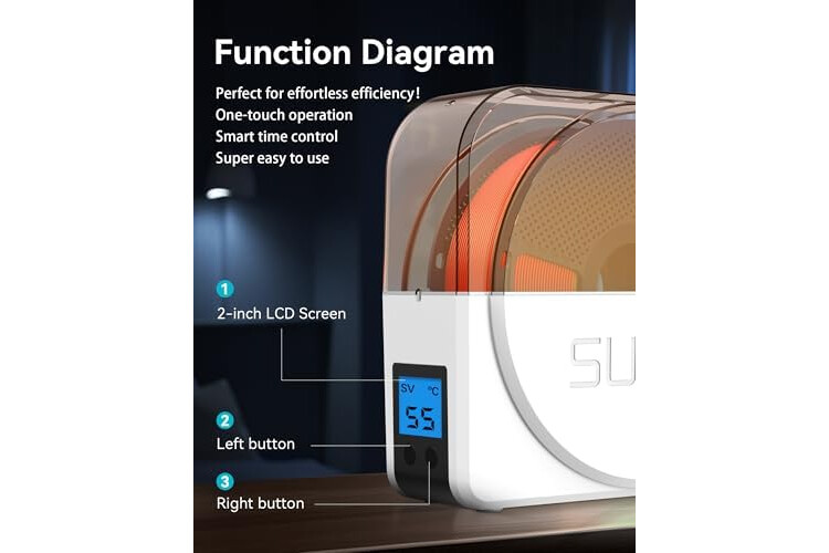 【Personalized Temperature Setting】The user can adjust the temperature of the drying box according to different 3d filament type, ambient temperature, humidity and other factors. Adjustable temperature range 35℃~55℃. Suitable for more than 20 kinds of 3d printing filament commonly used in the market