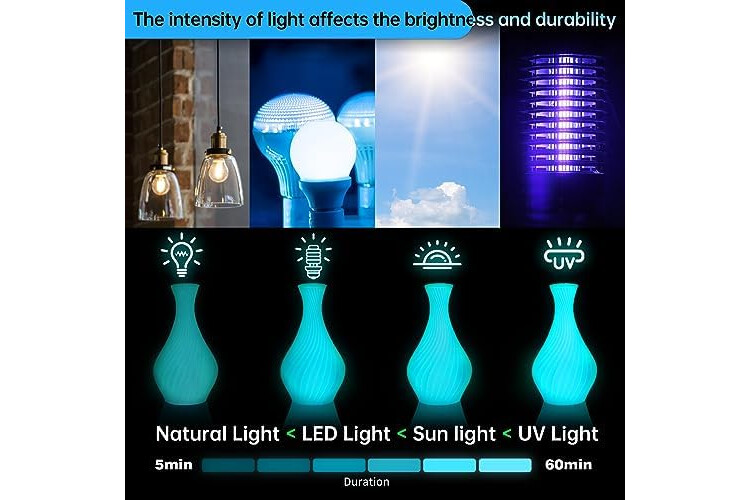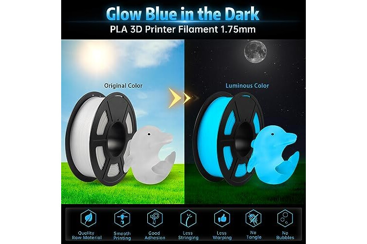 ① 【Glow in The Dark PLA Filament】Contains phosphorescent materials that glow in the dark after absorbing light energy; The glow effect is stronger when exposed to UV light. Please note that this type of filament should avoid long exposure to direct sunlight;The longer the exposure time, the faster the color fades.