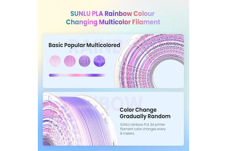 【Rainbow PLA Filament】- SUNLU Rainbow PLA filament is reliable, versatile, and easy to use. No clogs, bubbles and tangles, its excellent layer adhesion ensures high-quality prints every time.
