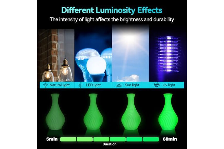 ①【Glow in the Dark PLA】SUNLU glow in the dark PLA filament contains phosphorescent materials, which can glow in the dark after absorbing light energy. If it is exposed to UV lights, the luminous effect will be better.