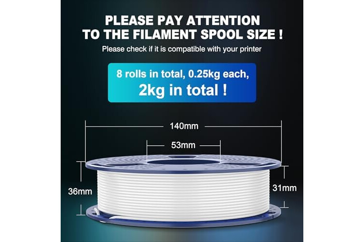 【Filament Spool Diameter】- PLA 0.25KG Spool Diameter: 140mm, Spool Width: 36mm, Spool Hub Hole Diameter: 53mm. Compatible with 99% of 3D printers.