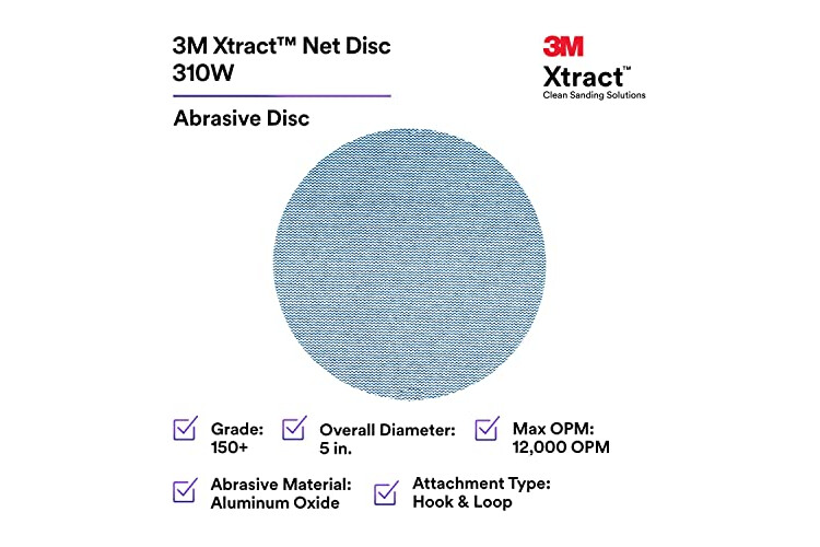 3M Xtract Net Disc 310W, 150+, 5 in, Die 500X, Pack of 50 Hook and Loop Sanding Discs, Virtually Dust-Free, Value Option for Metal, Wood, Composites, Stock Removal, and Fine Finishing