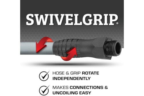 Male and female SwivelGrip Connections - Hose and grip rotate independently; Makes connections and uncoiling easy; Naturally releases coils