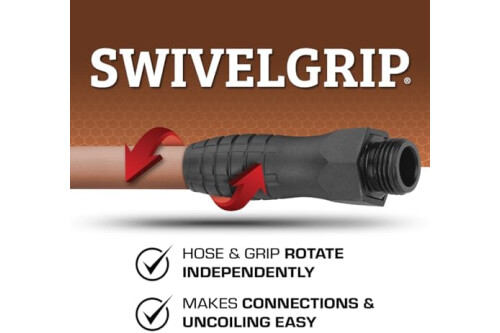 Male and female SwivelGrip Connections - Hose and grip rotate independently; Makes connections and uncoiling easy; Naturally releases coils