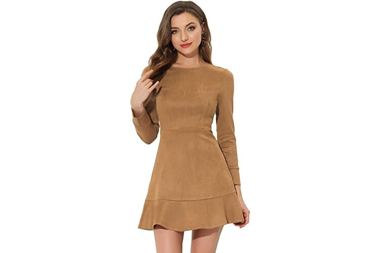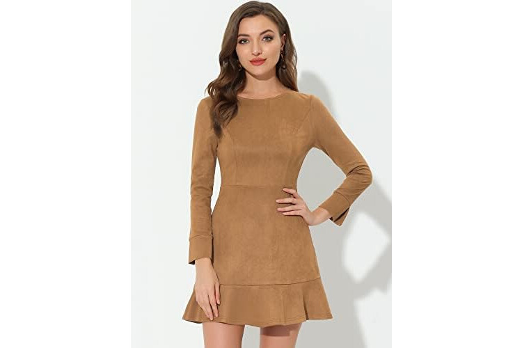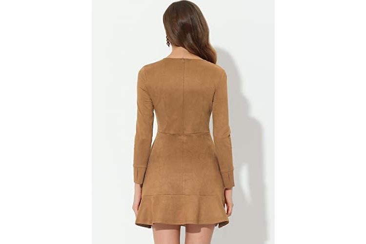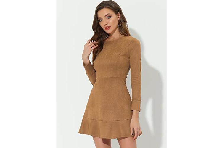 Allegra K Women's Faux Suede Round Neck Elegant Long Sleeve Ruffle Dress
