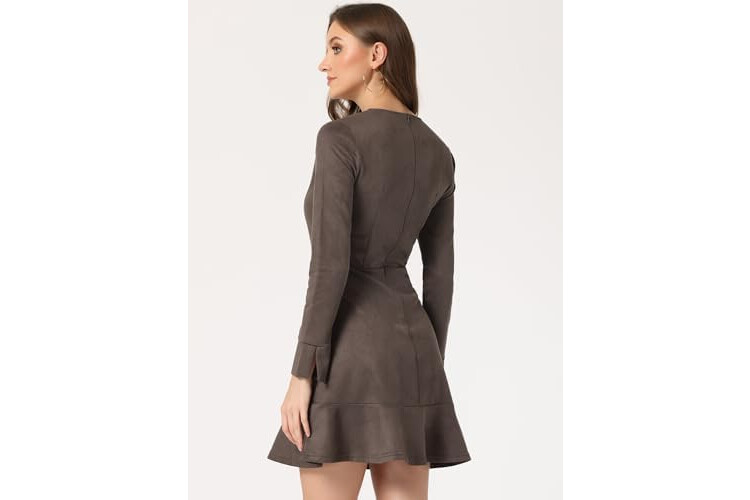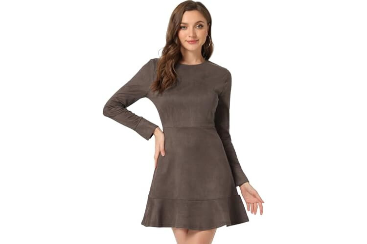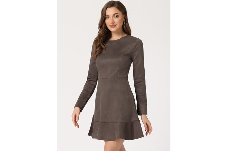 Allegra K Women's Faux Suede Round Neck Elegant Long Sleeve Ruffle Dress