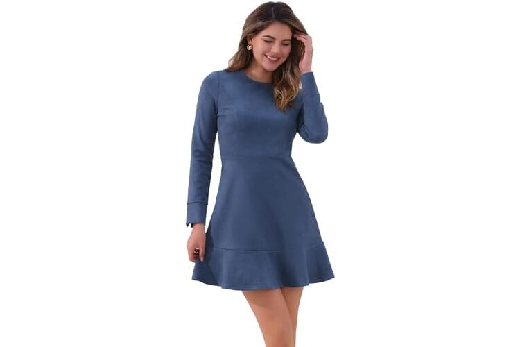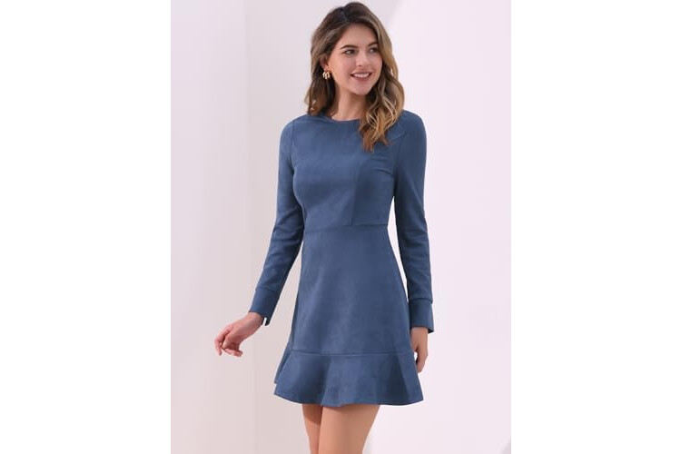 Allegra K Women's Faux Suede Round Neck Elegant Long Sleeve Ruffle Dress