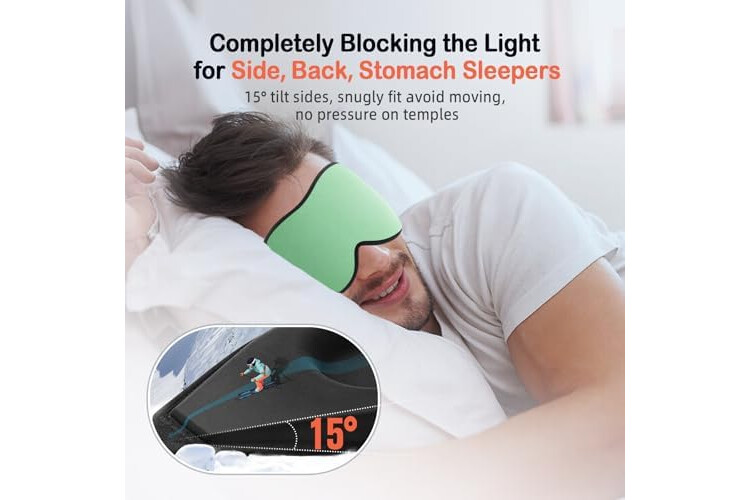 Completely Block Light for Side Sleeper: New design of 15° tilt angle ultra-thin sides of the eye mask for sleeping which can reduce 90% pressure on your temples. Sleep more comfortably when is on your side, a perfect light-blocking sleeping mask for back and stomach sleepers