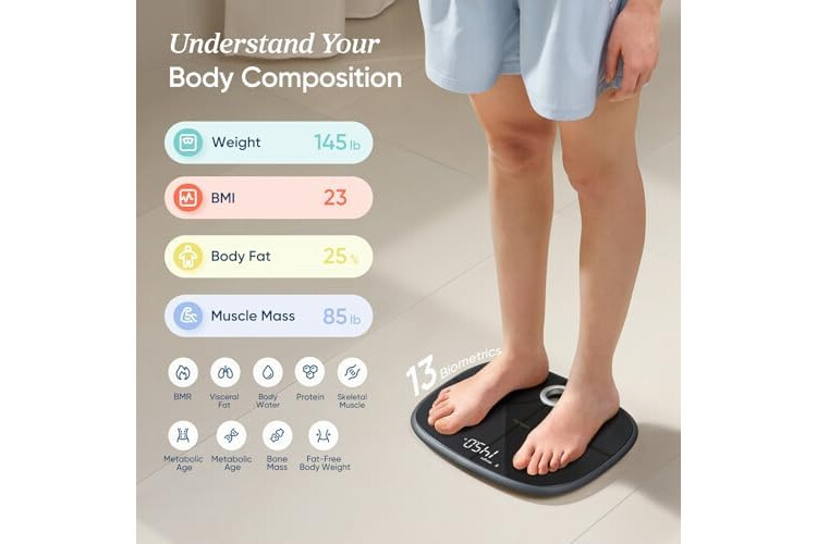 ๐๐ผ ๐๐ฒ๐๐ผ๐ป๐ฑ ๐๐ต๐ฒ ๐ฆ๐ฐ๐ฎ๐น๐ฒ: Track 13 key indicators, including Weight, BMI, Body Fat, and Muscle Mass. Accuracy down to 0.1 lb to track the progress your body is truly making