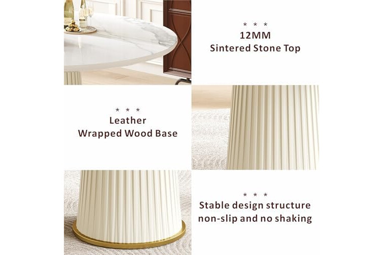 【Premium Materials & Modern Aesthetics】Featuring a 43.3-inch glossy sintered stone tabletop, this design offers scratch resistance, stain-proof ease, and effortless cleaning. The base integrates an iron core wrapped in pleated PU leather, blending durability with a sleek, contemporary look that enhances both dining and professional environments.
