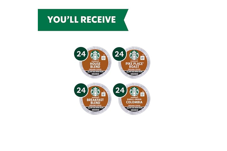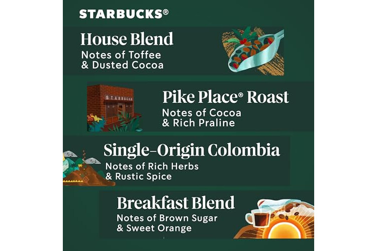 STARBUCKS VARIETY PACK—The Starbucks medium roast coffee variety pack includes Starbucks House Blend coffee, Starbucks Pike Place Roast coffee, Starbucks Single-Origin Colombia coffee and Starbucks Breakfast Blend coffee