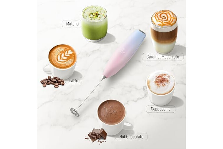• CREAMY VELVETY FROTH IN SECONDS: Making coffee-shop-style recipes at home is as simple as it can be with this milk frother. The 13,000 RPM motor and 25 spiral rings on the whisk let you whip up rich foam in no time. Level up your everyday warm or cold coffee, latte, cappuccino, hot chocolate, matcha, or powdered drinks with this coffee foam.