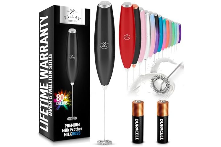 Zulay Kitchen Milk Frother Handheld Electric Whisk with AA Duracell Batteries – Durable Drink Mixer for Coffee, Lattes, Cappuccinos & More - Metallic Black