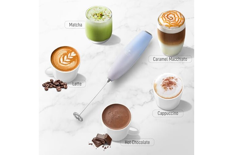 • CREAMY VELVETY FROTH IN SECONDS: Making coffee-shop-style recipes at home is as simple as it can be with this milk frother. The 13,000 RPM motor and 25 spiral rings on the whisk let you whip up rich foam in no time. Level up your everyday warm or cold coffee, latte, cappuccino, hot chocolate, matcha, or powdered drinks with this frother.