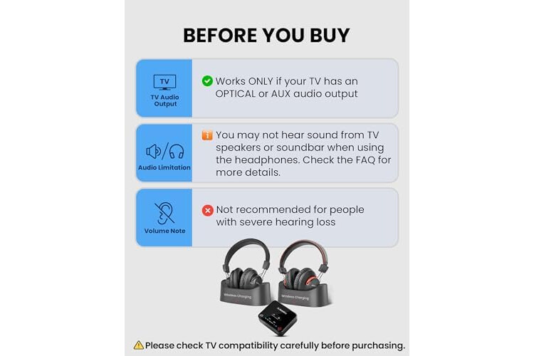 【Check TV Audio Output Before Purchase】Works with TVs that have Optical, AUX, or RCA audio output using the included transmitter. Not compatible with HDMI-only TVs. Does not support audio passthrough to a TV soundbar.