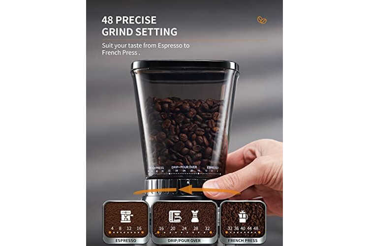 [ CHOOSE FROM 48 GRIND SETTINGS ] - This coffee bean grinder is designed with a conical burr grinder that operates at a low speed to minimize heat and help release the oils for optimal flavor. With 48 adjustable settings, create your perfect cup – from Espresso finesse to French press coarseness!