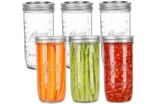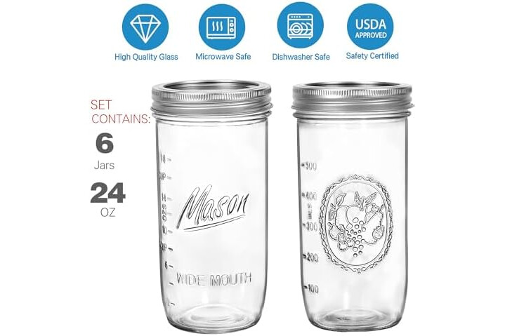 24 oz Wide Mouth Mason Jars - Canning Jars with Metal Airtight Lids and Bands, 24 ounce Mason Glass Jars for Fermenting, Pickling, Meal Prep, Overnight Oats, Jam, Jelly, DIY Projects (6 pack)