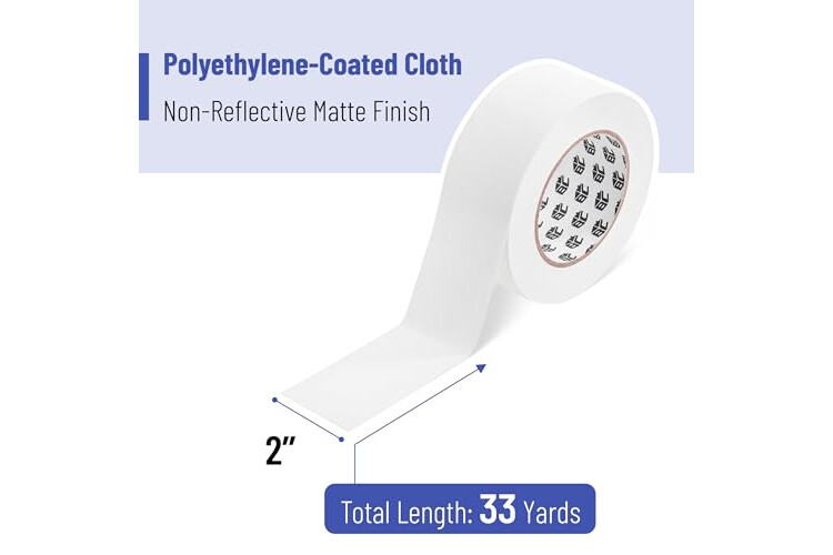 Made from polyethylene-coated cloth, this tape is tear-resistant and features a non-reflective surface, making it ideal for use in film, photography, and stage productions.