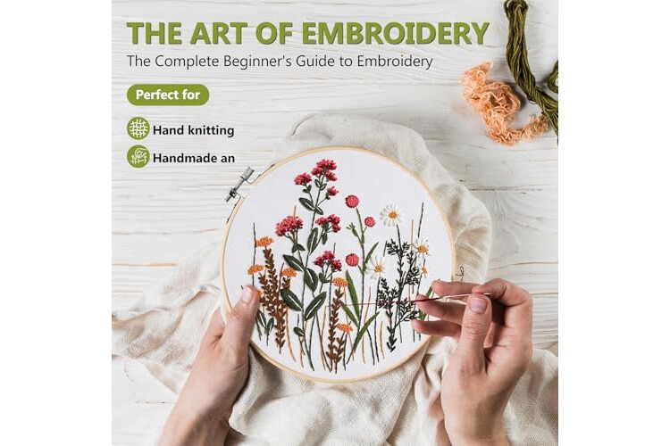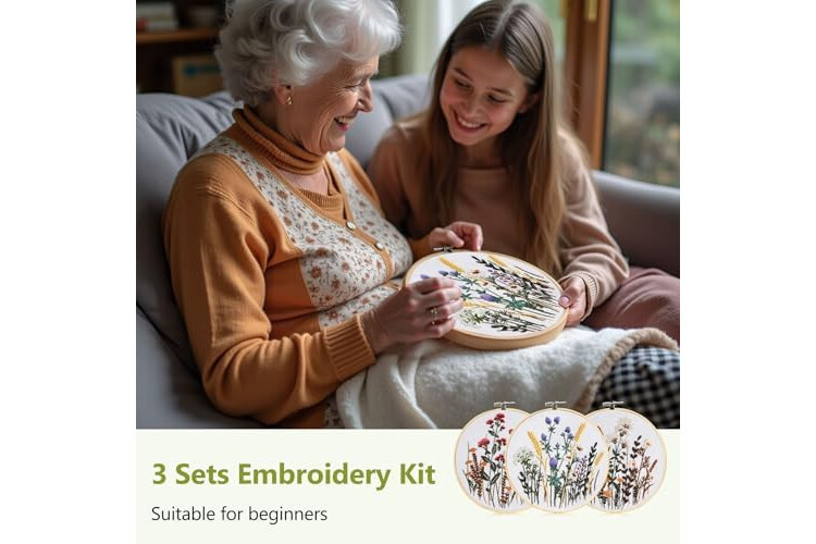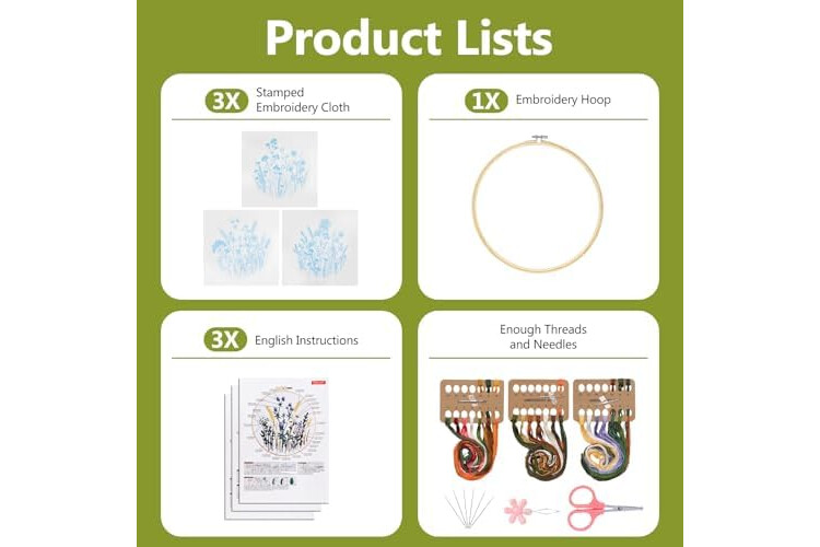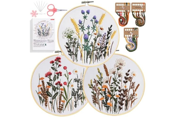ALL-INCLUSIVE EMBROIDERY KIT: Includes 3 patterned embroidery cloths, 6 embroidery needles, 3 instruction sheets, 3 packs of colored threads, and a 7.8-inch (20 cm) embroidery hoop. This kit makes it easy to embark on your embroidery journey.