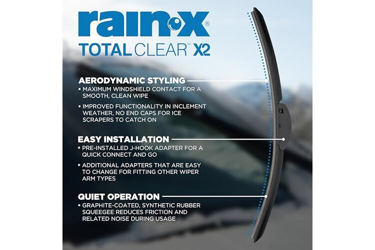 Rain-X Total Clear all-weather wiper blades are designed to keep your windshield clear no matter the weather conditions. Whether you’re driving through rain, snow, or sleet, these blades ensure a smooth, clean wipe performance for optimal, safe driving visibility. Rain-X Total Clear 2-packs offer two wiper blades in one convenient package - perfect for easily replacing both of your vehicle’s front windshield wiper blades at once. The sleek, aerodynamic styling looks great on any vehicle and offers improved functionality in inclement weather, with no end caps to prevent ice scrapers from catching. Plus, their quiet operation means you can enjoy a smooth, chatter-free experience during inclement weather.