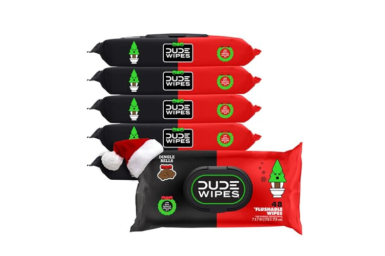 DUDE Wipes Dingle Bells Flushable Wipes - Holiday Scented Extra-Large Adult Wet Wipes - 6 Pack (288 Count) - Infused with Clove, Balsam, Vitamin E, and Aloe - Septic and Sewer Safe