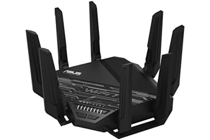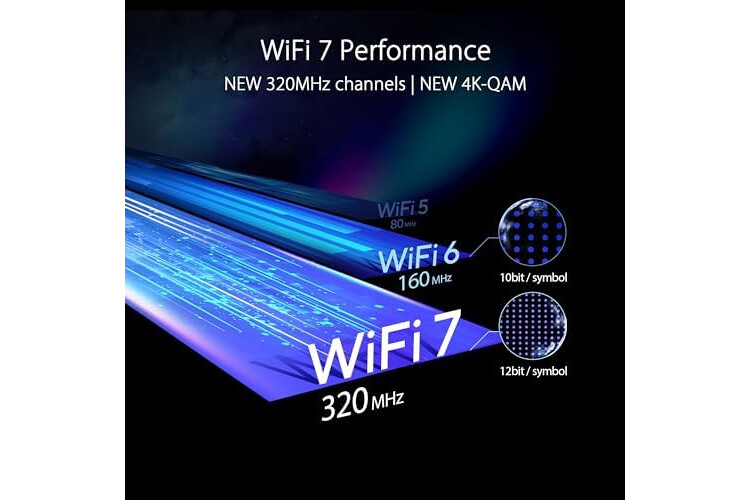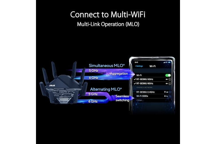 • ASUS RT-BE96U BE19000 802.11BE Tri-band Performance WiFi 7 Extendable Router with 6GHz Support, Dual 10G Port, 320MHz Bandwidth & 4096-QAM, Lifetime Internet Security, MLO, AiMesh Support