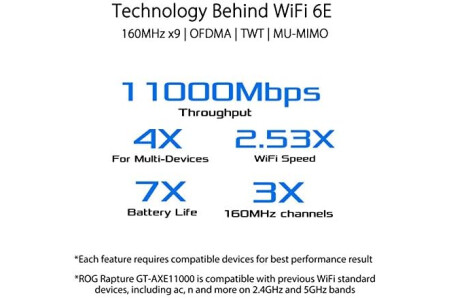 Next-gen WiFi standard – World's first Wi-Fi 6E tri-band router boosts speeds up to 11000 Mbps..Power Supply : AC Input : 110V~240V(50~60Hz), DC Output : 19 V with max. 3.42 A /19.5 V with max. 3.33 A.