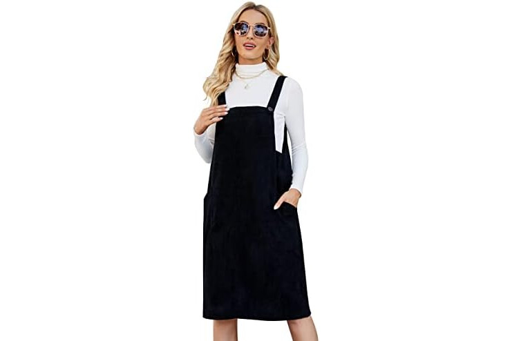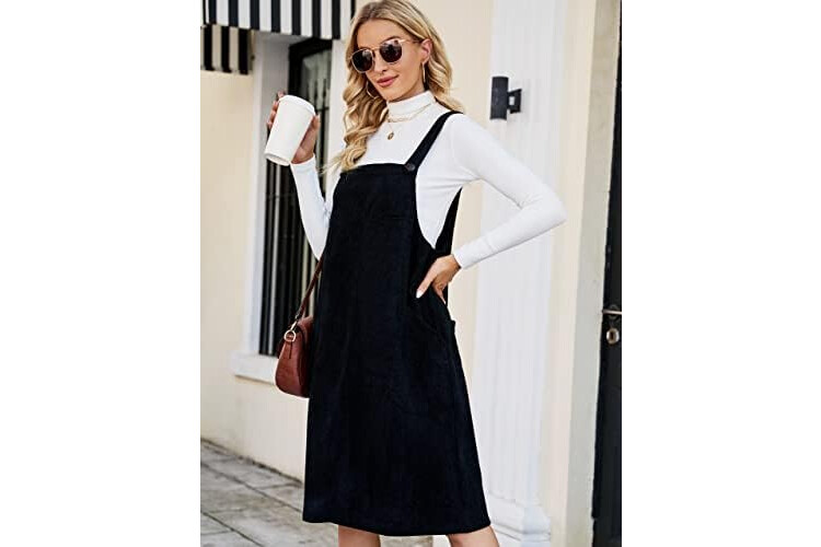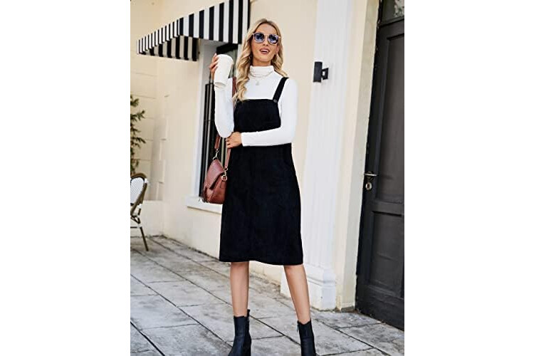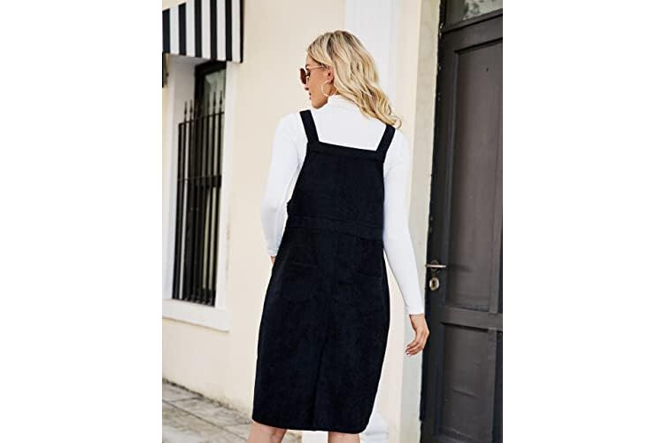 Flygo Women's Corduroy Jumper Overall Pinafore Midi Dress Skirt with Pockets