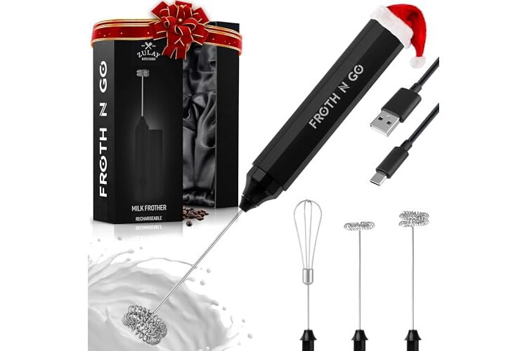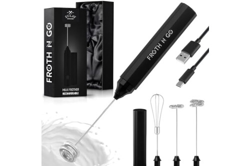 Zulay Froth N Go Milk Frother – Rechargeable 3-in-1 Handheld Frother Wand with Travel Case & USB-C Charger – Single, Double & Egg Whisk for Latte, Cappuccino, Matcha, Protein Shakes – Black