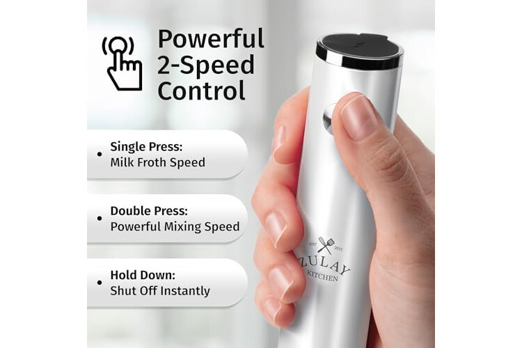 • POWERFUL 2-SPEED MOTOR: Zulay electric whisk frother has a strong motor that quickly creates rich foam. With normal and turbo modes, you can adjust frothing for any drink making it the perfect electric frother for coffee or frother for protein powder.