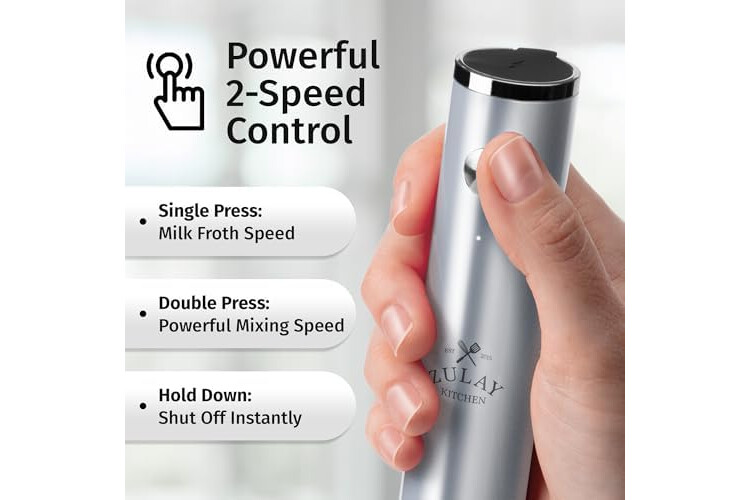 • POWERFUL 2-SPEED MOTOR: Zulay electric whisk frother has a strong motor that quickly creates rich foam. With normal and turbo modes, you can adjust frothing for any drink making it the perfect electric frother for coffee or frother for protein powder.