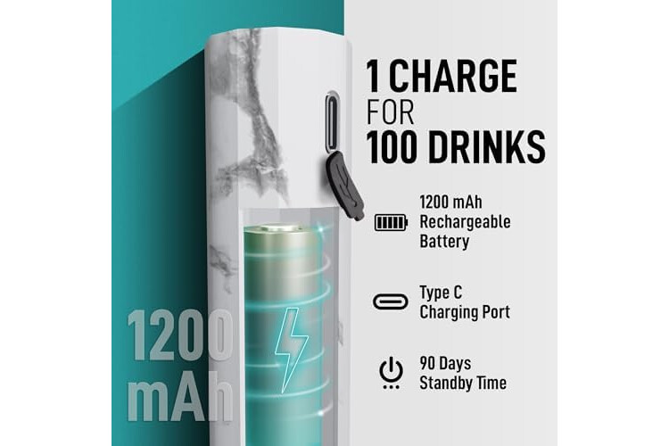 Long-Lasting Rechargeable Battery: 1200 mAh lithium battery provides up to 100 drinks per charge with 90 days standby time. USB-C charging completes in just 2.5 hours for convenient, cordless use at home, office, or on-the-go.