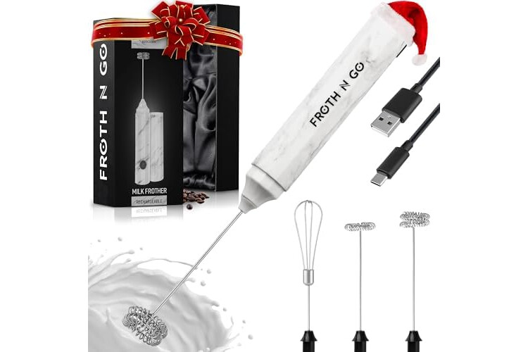 Zulay Froth N Go Milk Frother – Rechargeable 3-in-1 Handheld Frother Wand with Travel Case & USB-C Charger – Single, Double & Egg Whisk for Latte, Cappuccino, Matcha, Protein Shakes – White Marble