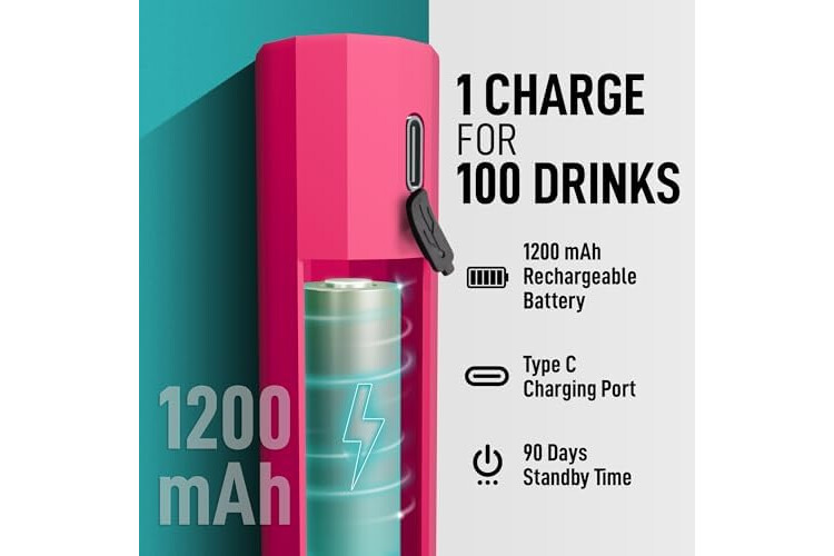 Long-Lasting Rechargeable Battery: 1200 mAh lithium battery provides up to 100 drinks per charge with 90 days standby time. USB-C charging completes in just 2.5 hours for convenient, cordless use at home, office, or on-the-go.