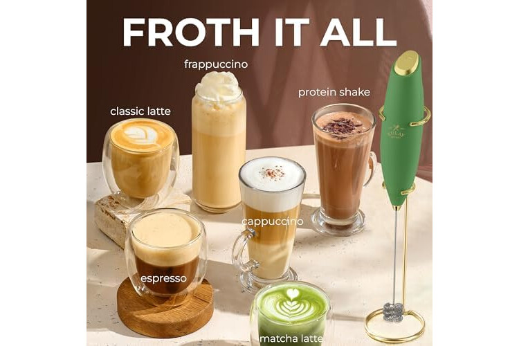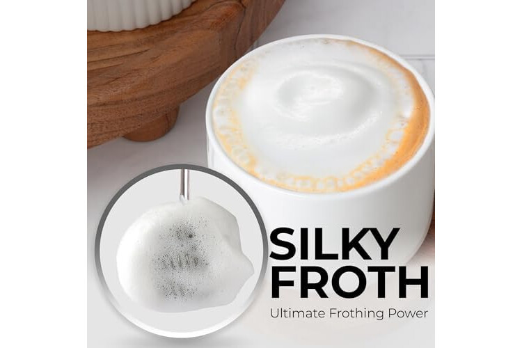 MAKE RICH, CREAMY FROTH IN SECONDS: Create café-quality foam for coffee, lattes, cappuccinos, hot chocolate, and matcha with this handheld frother wand. Perfect for milk, cream, or non-dairy alternatives.