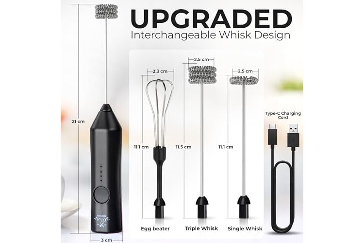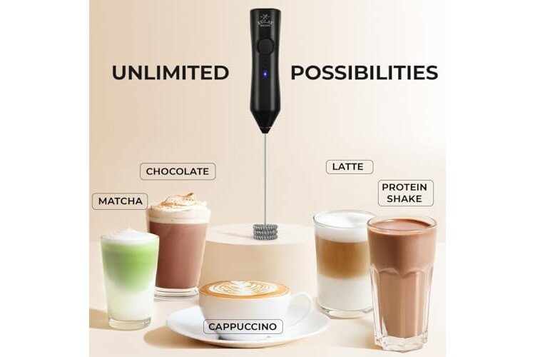 INCLUDES 3 VERSATILE WHISK ATTACHMENTS: Comes with a single coil whisk for light froth, a double coil whisk for dense foam, and a balloon whisk for blending and whipping. Easily swap attachments to match your drink or recipe needs.