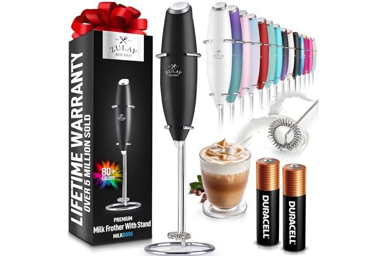 Zulay Kitchen Powerful Milk Frother Wand With 2 Duracell Batteries - Ultra Fast Handheld Drink Mixer - Electric Whisk Foam Maker for Coffee, Lattes, Cappuccino, Matcha, Hot Chocolate & Creamer - Black